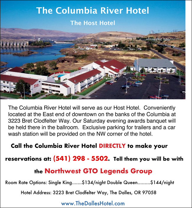 ONLINE REGISTRATION IS OPEN!PLEASE REGISTER ONLINE NOW Welcome to the 2026 Pontiacs on the Columbia EventWe are excited to host this year’s 2026 Pontiacs on the Columbia in The Dalles, OR – at The Dalles Riverfront Park. Over the Memorial Day weekend of May 22nd/23rd/24th, we have created an All-Pontiac car show and a number of activities for you to enjoy with your Pontiac Nation brothers & sisters, in the great northwest. Register early and don’t worry, all registrations will be completely refundable if you can’t make it for any reason. See you in May, on the Columbia River!